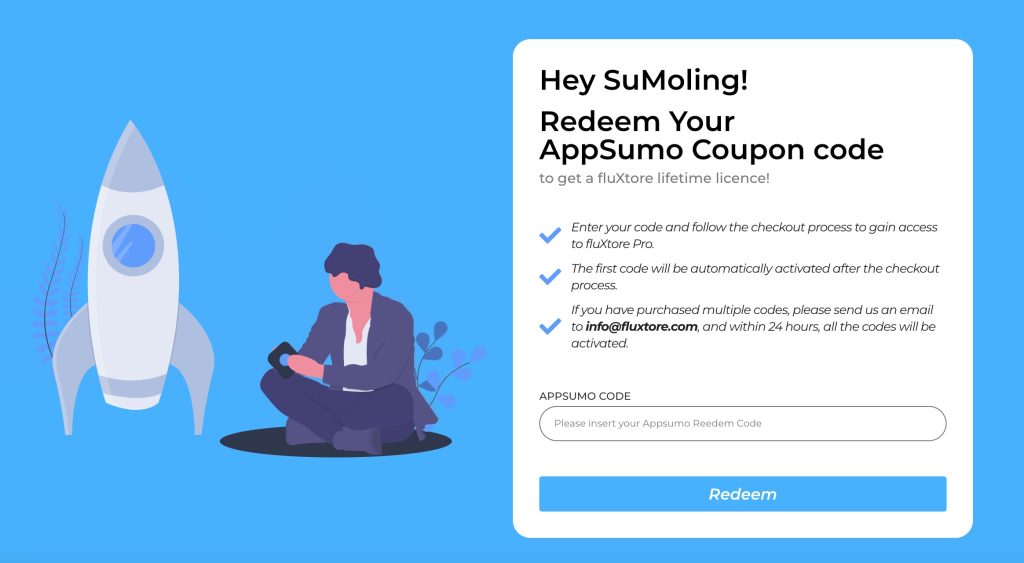 Step 3: Redeeming the Code on the fluXtore Website: Visit fluxtore.com/appsumo on your web browser. Paste the code you copied earlier into the provided form and click on the “Redeem” button to proceed.